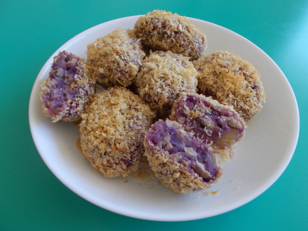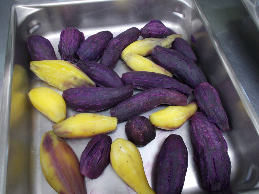 いろんな種類のさつまいもを送ってくださり、今回は見慣れた黄色いさつまいもの他にも紫のおいもがたくさん!調理さんが作ってくれたさつまいもコロッケもきれいな紫色に仕上がりました。