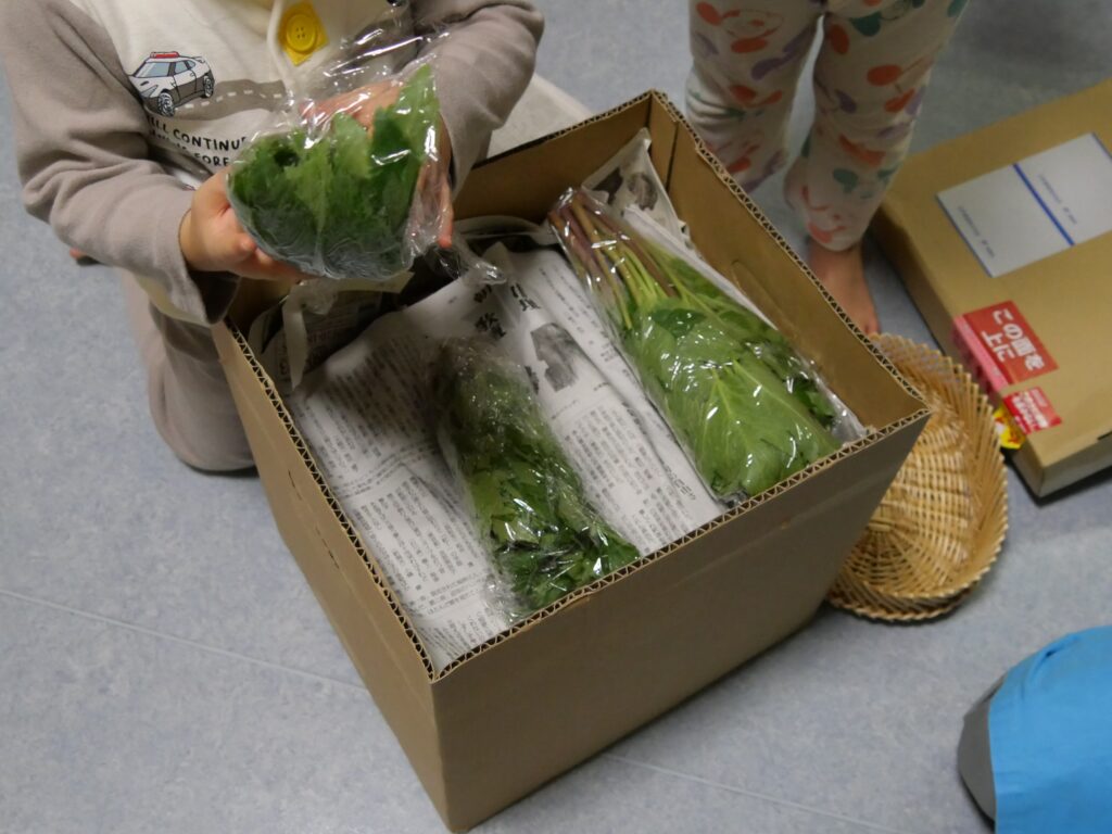 子ども達と一緒に開封してみると新鮮な明日葉と箱いっぱいに詰まったさつまいも!