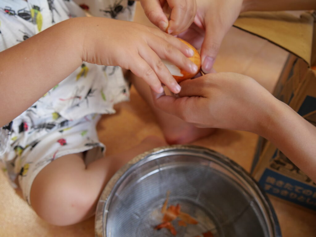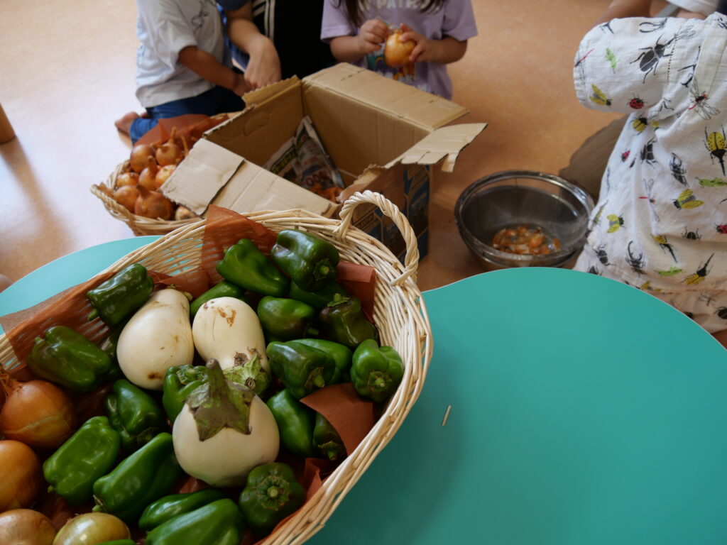 新島村の皆さまから、彩り豊かな夏のお野菜と白茄子という珍しいお野菜をたくさん頂戴いたしました。玉ねぎは子どもの手にとりやすいサイズで、開封させていただく時に一緒にいた男の子が、玉ねぎを剥いてみたいということで、ちゃーちゃんにお手伝いしてもらいながら、皮むきを始めました。その姿はとても真剣で、途中でやめることなく最後まで剥き切ることが出来ました。