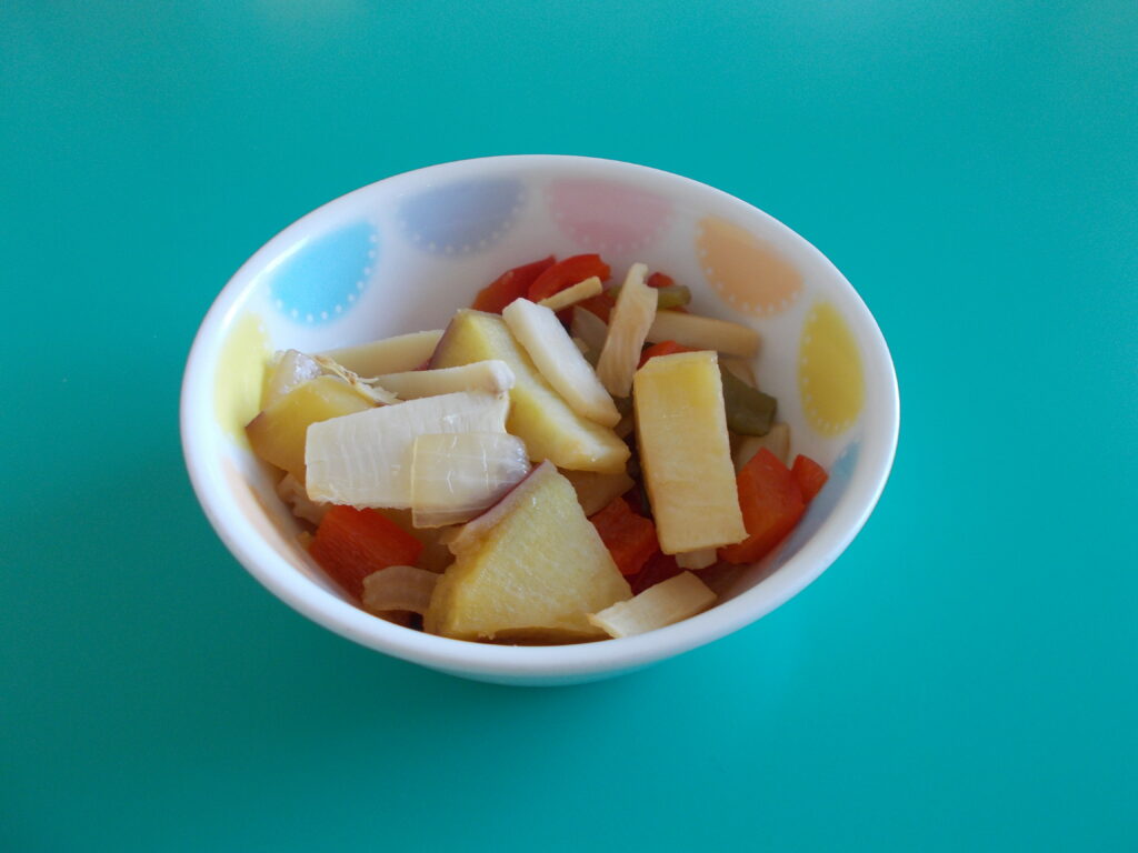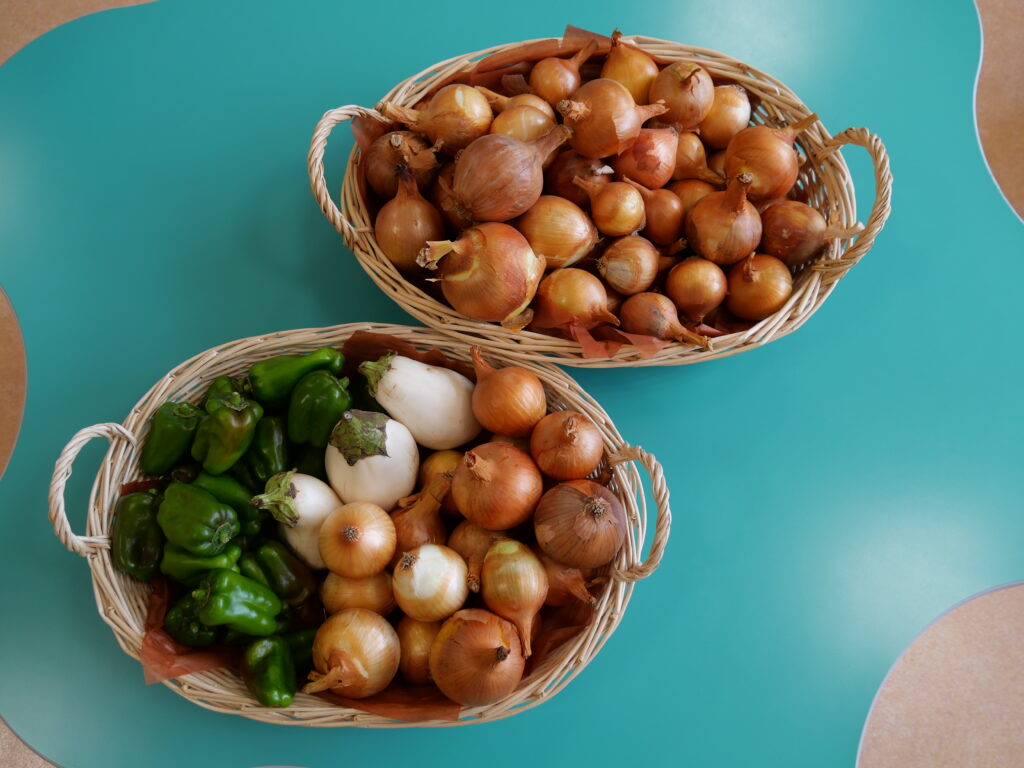 剥けた玉ねぎを調理さんに、『むけたよー!』と伝え、満足そうなその子の表情に、私たち職員もとても嬉しくなり、新島村の皆さまのお気持ちで、子どもたちも職員もほっこりする1ページとなりました。後日、調理さんに白茄子はさばと南蛮漬けに、玉ねぎはさつま芋の中華炒めに、ピーマンもカリカリに食べやすく調理してくださり、みんなで美味しく頂きました。