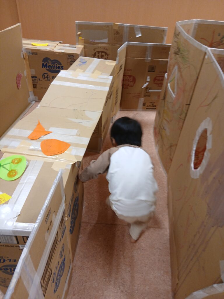 迷路を見た瞬間に大興奮の子ども達。「こっちかな」「行き止まりだ!」と試行錯誤しながらゴールを一生懸命探します。ゴールを見つけた後は、段ボール迷路のどこかに貼られている自分のシンボルマーク探し。自分のマークを見つけるといい笑顔を見せてくれました。先月の段ボール遊びから発展して、目一杯楽しむことができました。ベビーホームの子どもたちだけではなく、パークハイムのお子さんや、にこにこパークの親子さん、スコーレ白百合の利用者さんも、一緒に楽しんでくれました。