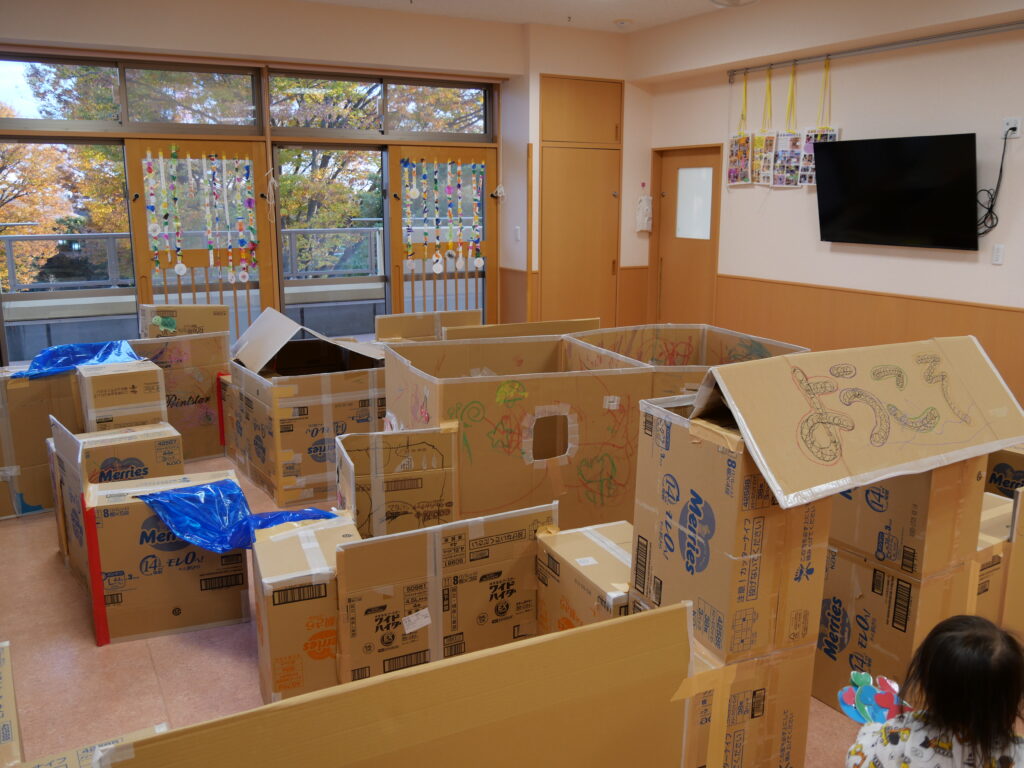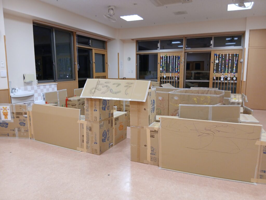 先日のブログ(No.135 アートプログラム)でご紹介した段ボール遊びや、ユニットで遊んだ段ボール遊びから、今年も巨大段ボール遊びに発展しました!保育の質向上委員会のメンバーや、有志で参加してくれた職員で作成。迷路の真ん中には、アートプログラムで作ったお家も配置。少し休憩できる椅子を置き、ゆったりと遊べる迷路を作りました。作りながら、子どもの目線に立って、これなら面白いね!とメンバーの話も弾みます。