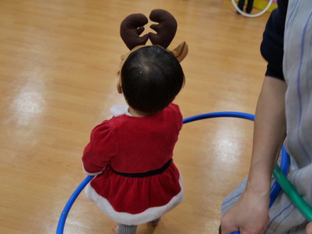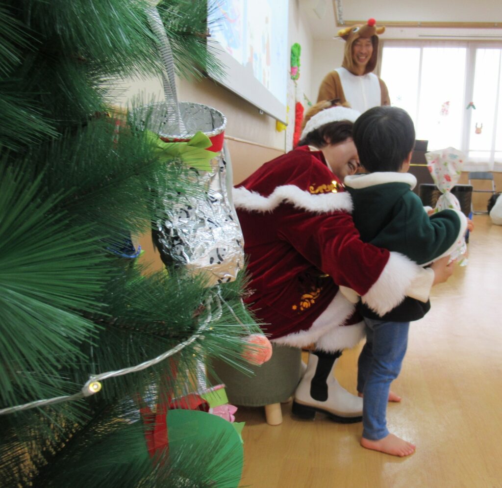 「さあ、ベビーホームのお友だちの所にも、サンタさんがくるかな?」という絵本のストーリーを引き継いで・・・待ちに待ったサンタさん登場です。子どもたちは目をキラキラさせて、ドキドキ、わくわく!皆の前をぐるっと歩いて回ったサンタさんから、一人ひとりにプレゼントを渡してもらいました。プレゼントをもらった子どもたちは、すぐに袋を開けて嬉しそうに遊び始めていました。サンタさん、ありがとう!