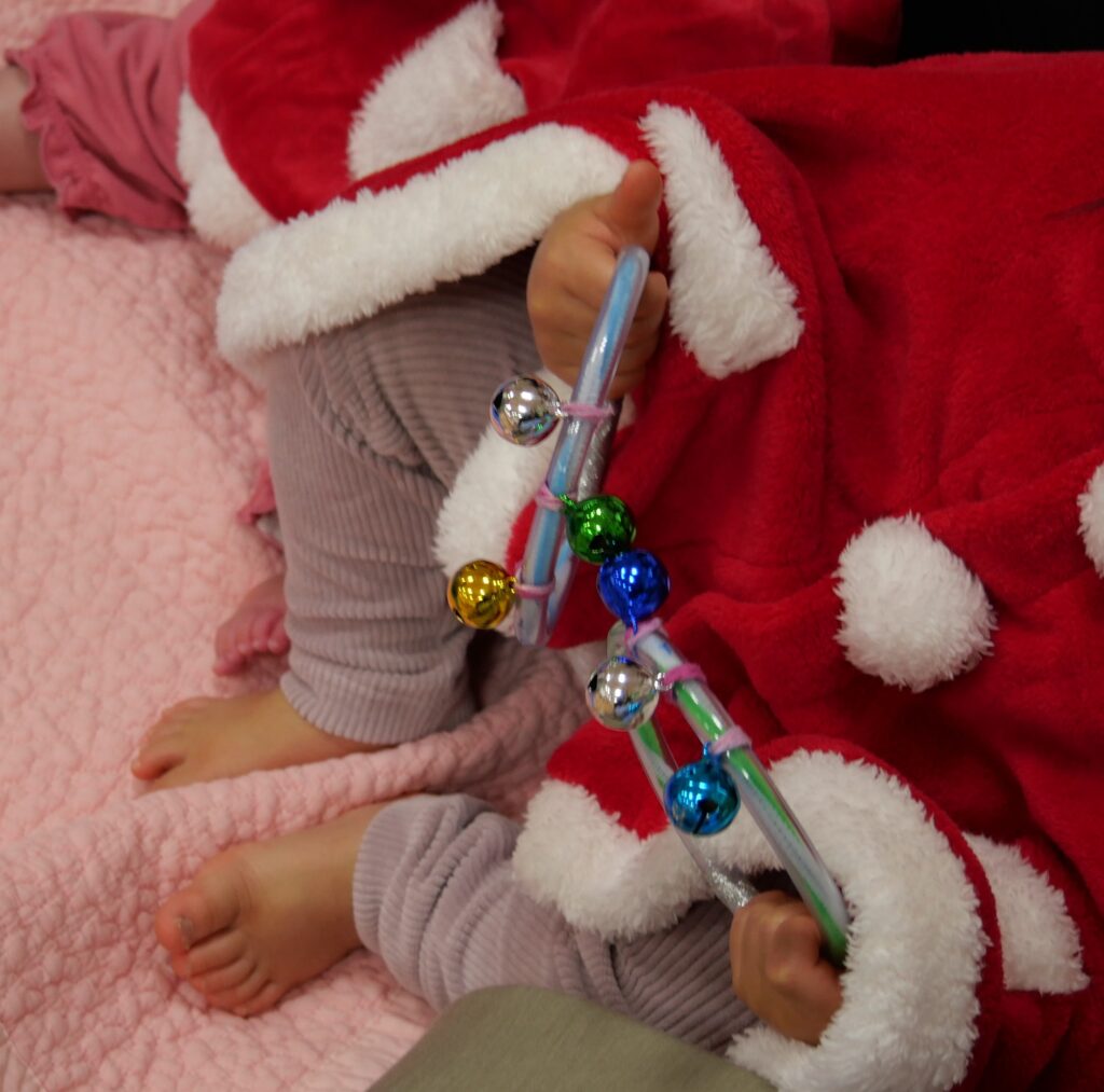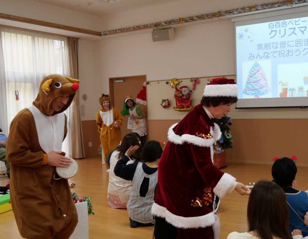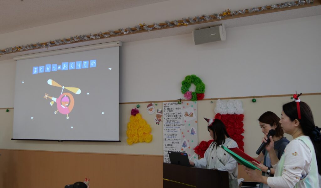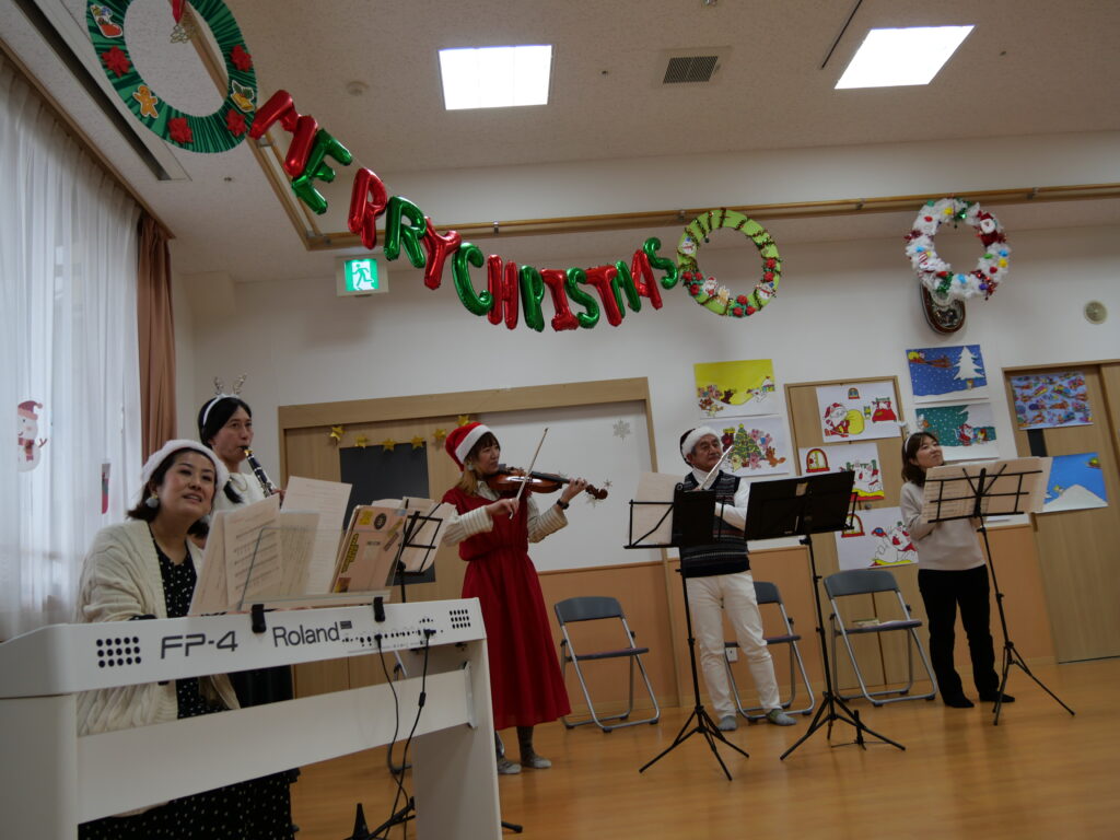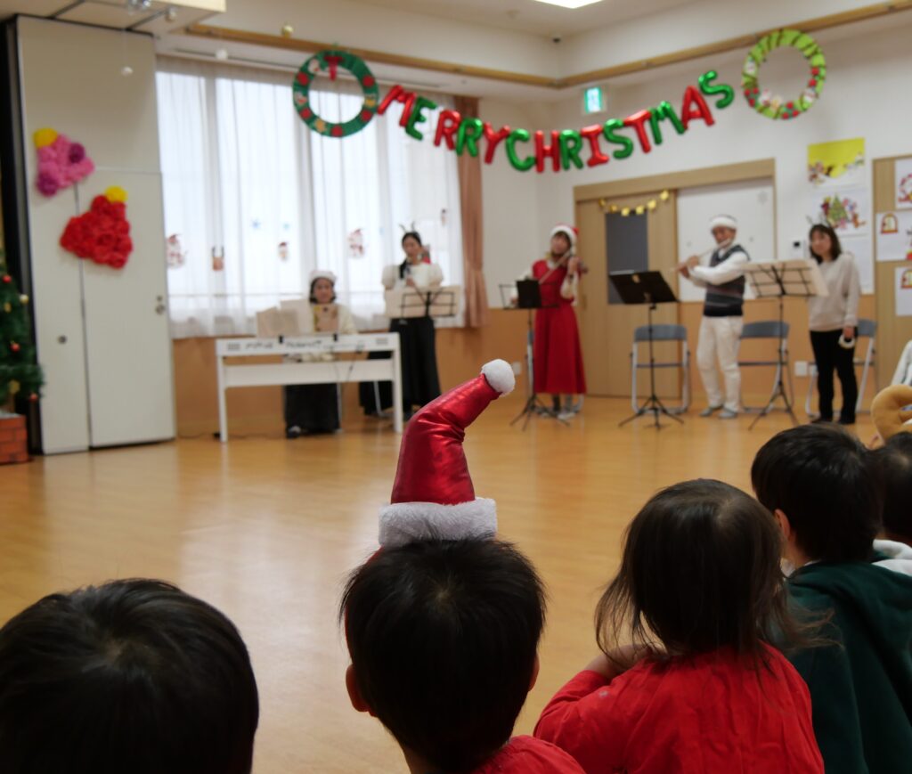 12月25日クリスマス会を行いました。2025年のテーマは「素敵な音に囲まれて・・・みんなで祝おうクリスマス!」でした。ダッドウェイさんが、今年も楽器の演奏をしにきてくれました。バイオリンやクラリネット、フルートなど、普段はあまり馴染みのない楽器を一つひとつ紹介し、生演奏を披露してくださいました。演奏に合わせて体を揺らす子、手を叩く子、間近に楽器を見にいく子、寄付でいただいた太鼓を鳴らす子など、子どもたちの反応は様々ですが、音に合わせてそれぞれの表現を楽しんでいる子どもたちは、とても生き生きとした笑顔で溢れていました。