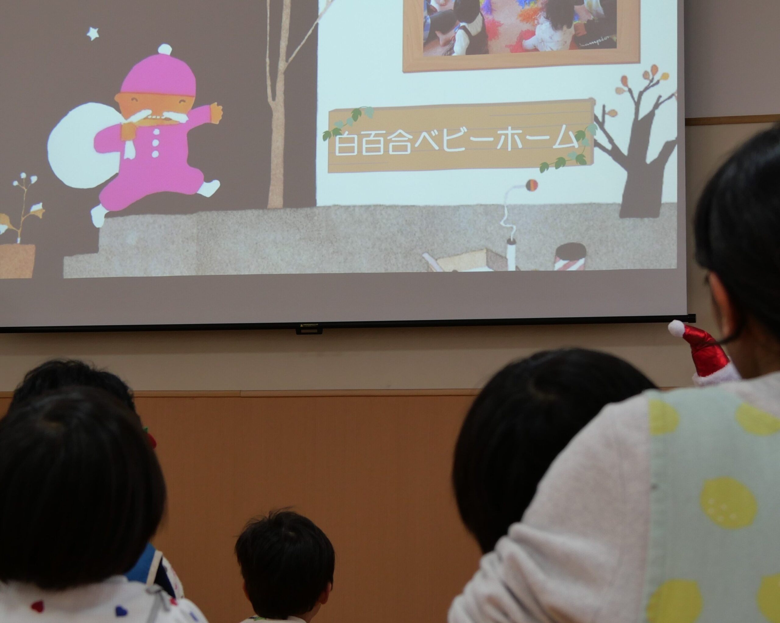 その後の、ちゃーちゃんたちからのお楽しみ絵本は、「まどから おくりもの」。いつもはお部屋で読み聞かせをしてもらっていましたが、なんとこの日は、絵本が大きなスクリーンに!そして絵が動くしかけが施されていました。動く絵本の世界観にぐぐっと引き込まれ、じっくりと見入っていました。