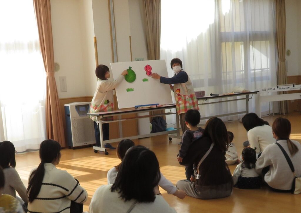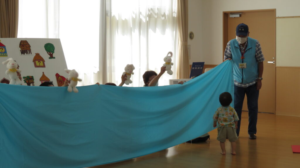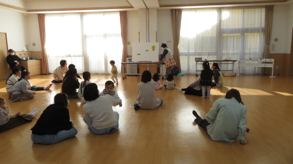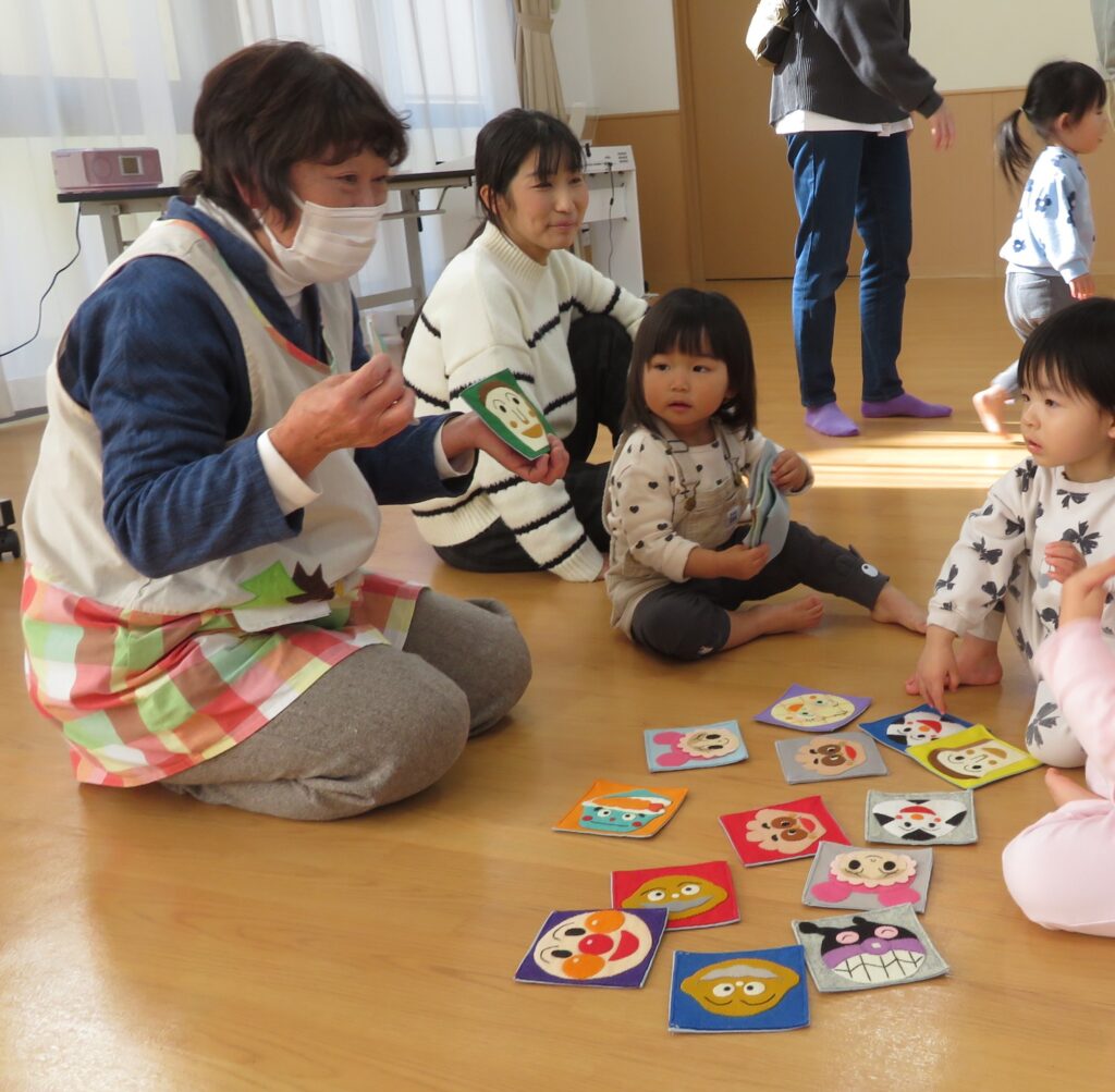 今回は普段サロンで行っている手遊びやパネルシアターを中心にミニリトミックや大きなビニールボールなどで遊びました。また後半には参加者同士の交流の時間を設けることでお子さんを遊ばせながらママ同士お話をして過ごしています。おもちゃは泉区で活動している「いずみ布おもちゃぐるーぷ」さんより手作りの車と道路、アンパンマンの絵合わせカードなどをお借りし、普段のひろばにはないおもちゃに子ども達も喜んで遊んでいました。
